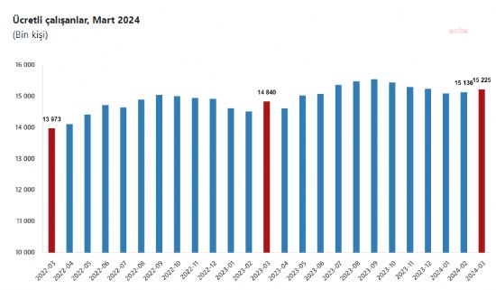 TÜİK, "Ücretli Çalışan İstatistikleri Mart -2024" bültenini yayınladı. Buna göre sanayi, inşaat ve ticaret-hizmet sektörleri toplamında ücretli çalışan sayısı 2...