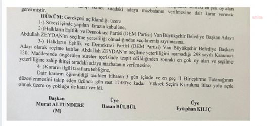 Van`da İl Seçim Kurulu kararı ile Van Büyükşehir Belediye Başkanlığı için mazbata Abdullah Zeydan yerine AKP`nin adayı Abdulahat Arvas`a verildi. Kararda, "DEM ...