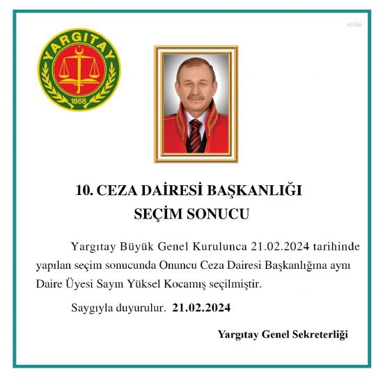 Yargıtay Büyük Genel Kurulu`nca 10. Ceza Dairesi Başkanlığı`na Yüksel Kocamış seçildi. ...